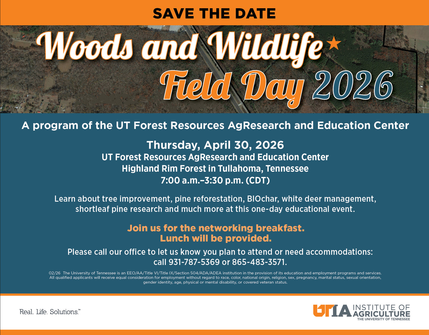 This Spring the Highland Rim Forest Unit of the UT Forest Resources AgResearch and Education Center is hosting a Woods and Wildlife Field Day event at our location in Tullahoma, TN. The event takes place Thursday, April 30th, 2026 from 7:00 a.m. thru 3:30 p.m. (CDT). Don’t miss this opportunity to learn more about tree improvement, pine reforestation, and many other research and stewardship practices useful to landowners with forest management goals!